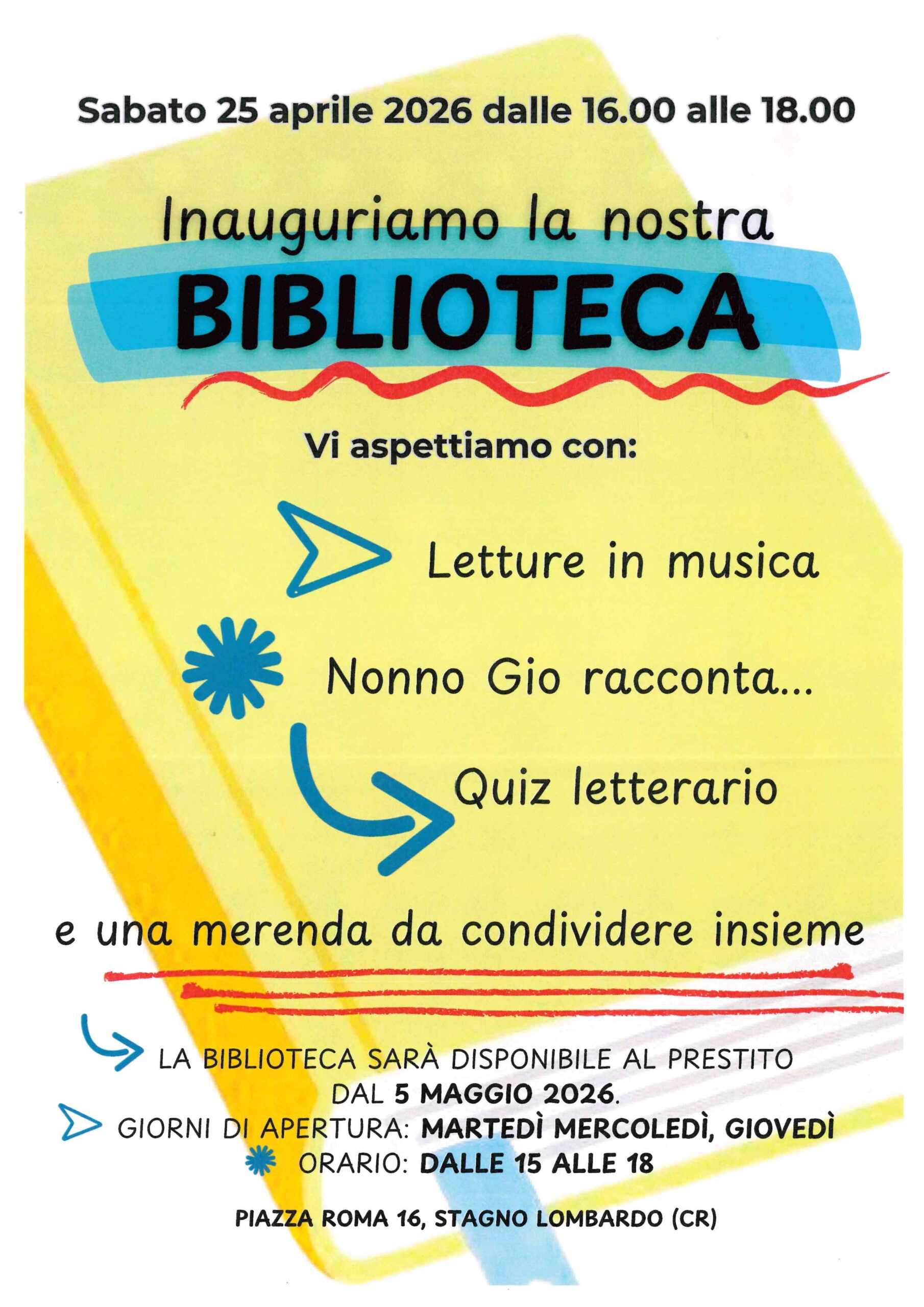 In data 25 APRILE 2026 dalle ore 16:00 alle ore 18:00 vi sarà l'inaugurazione della nuova biblioteca comunale con LETTURE, QUIZ LETTERARI E MERENDA INSIEME